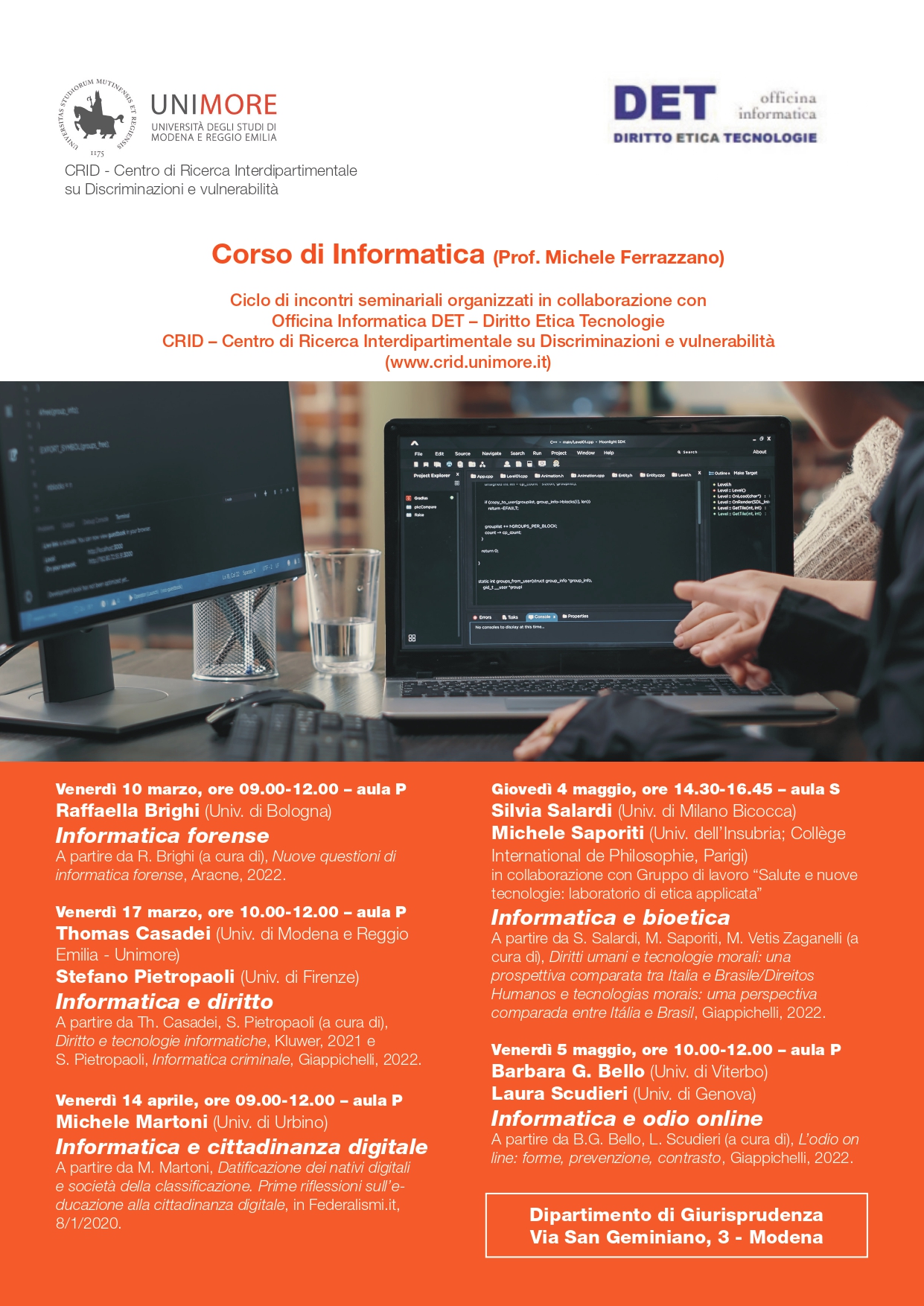 Ciclo di incontri seminariali organizzato nell'ambito del Corso di Informatica, tenuto dal Professor Michele Ferrazzano, in collaborazione con l' Officina informatica DET Diritto Etica Tecnologie del CRID Centro di Ricerca Interdipartimentale su Discriminazioni e vulnerabilità.